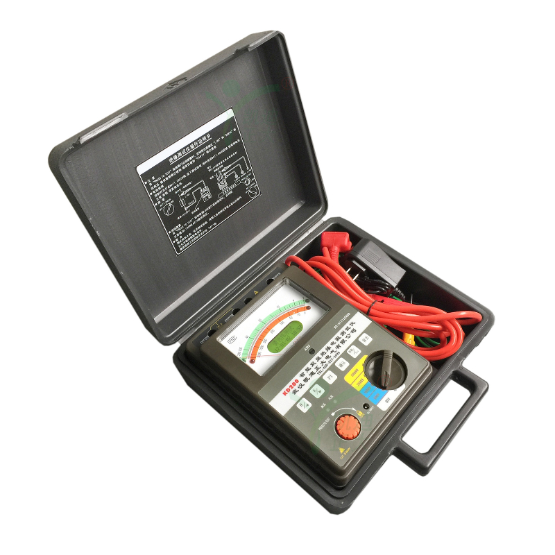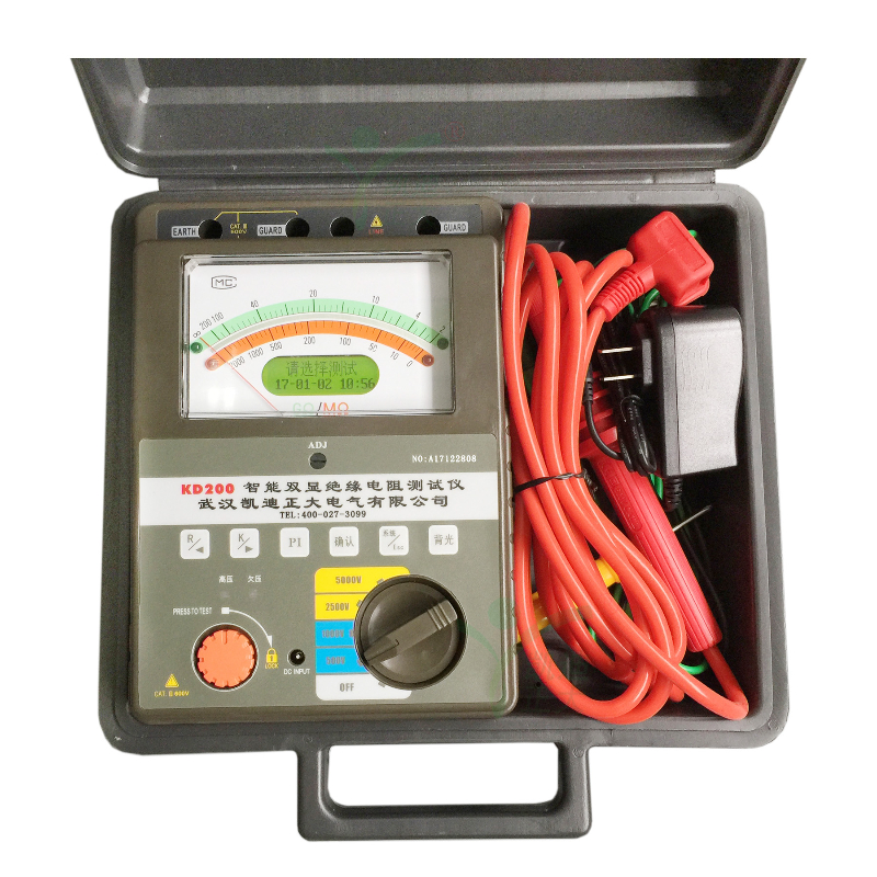 武漢凱迪正大電氣有限公司專業生產的KD200系列型智能雙顯絕緣電阻測試儀采用嵌入式工業單片機實時操作系統,薄形張絲表頭與圖形點陣液晶顯示器較好結合,KD200系列表具有多種電壓輸出等級(500V、1000V、2500V、5000V)、容量大、抗干擾強、指針與數字同步顯示、交直流兩用、操作簡單、自動計算各種絕緣指標(吸收比、極化指數)、各種測量結果具有防掉電功能等特點。是測量大容量變壓器、互感器、發電機、高壓電動機、電力電容、電力電纜、避雷器等絕緣電阻的測試儀器。