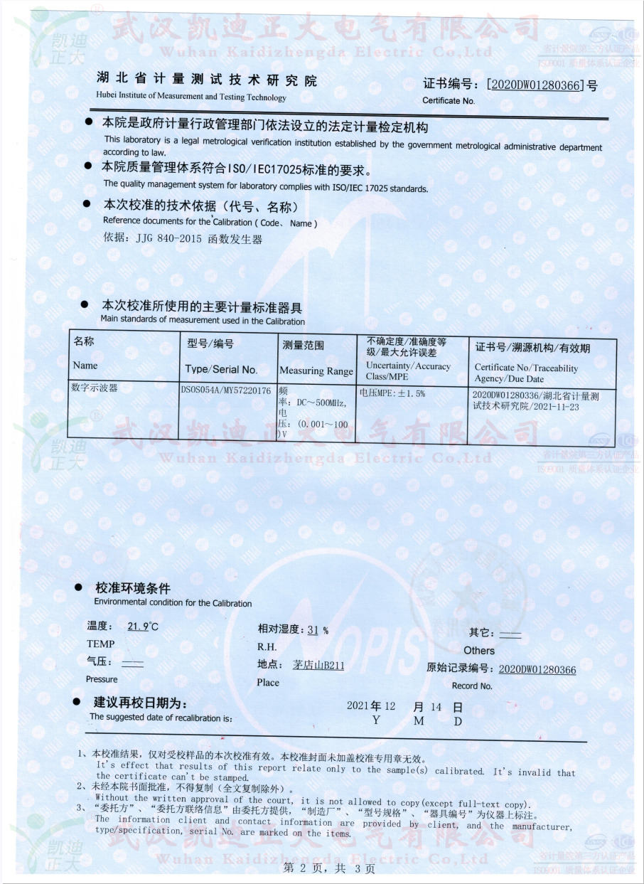 繼我司抽檢10套KDJK-10A配網單相接地故障定位儀送往湖北省計量測試技術研究院校準,此次獲得電學所檢測設備DS0S054A數字示波器標準設備的數據:輸出波形正玄波、異頻信號21.627Hz、輸出電壓8.677kV、頻率測量的不確定度0.006%。符合武漢凱迪正大公司和國家電力規程標準。同時獲得科學技術部火炬高技術產業開發中心、武漢市科技局認定武漢市創新產品證書。