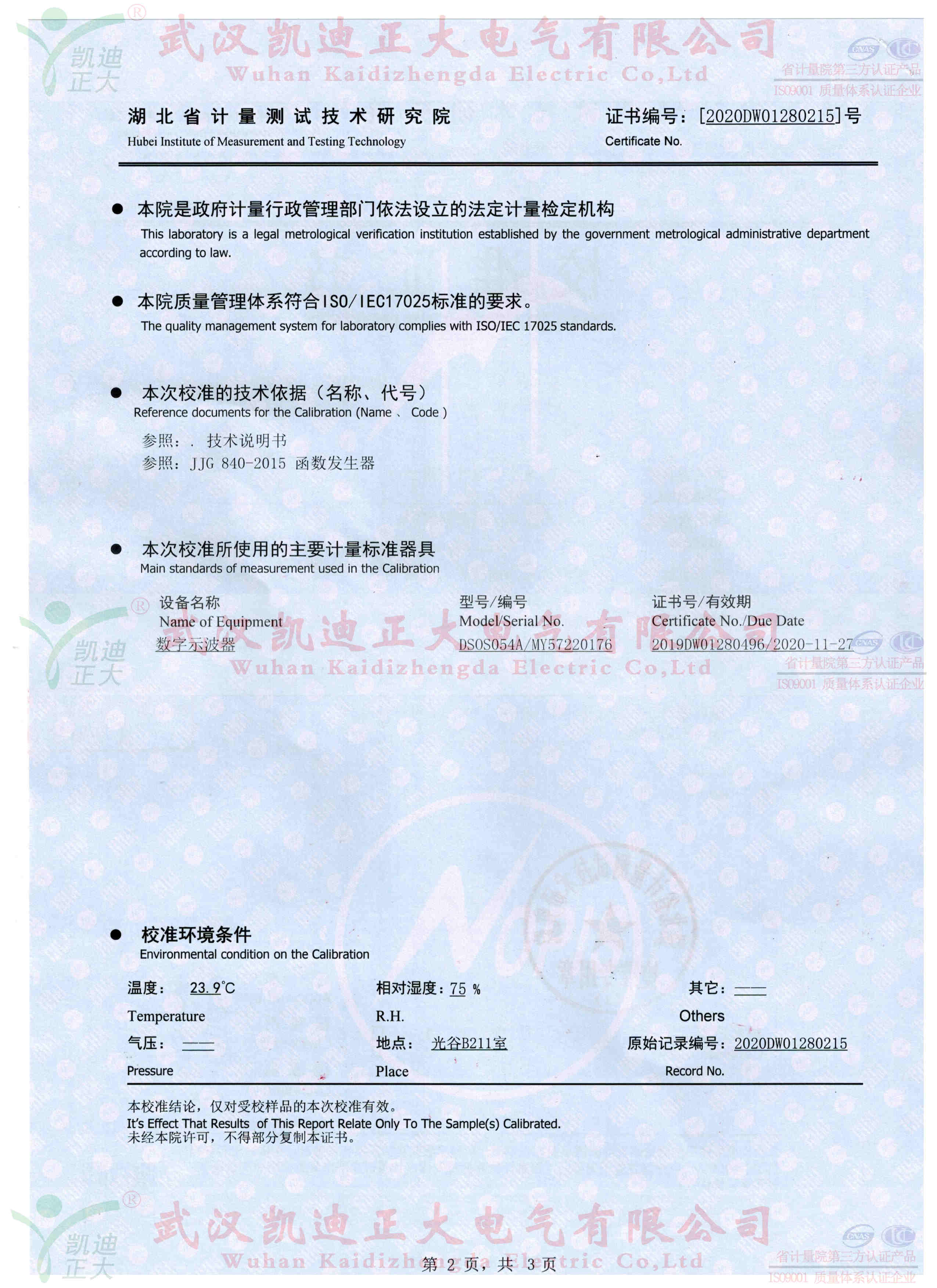 我司抽檢10套10kV配網單相接地故障定位儀送往湖北省計量測試技術研究院校準,獲得電學所檢測設備DS0S054A數字示波器標準設備的數據:輸出波形正玄波、異頻信號21.598Hz、輸出電壓8.603kV、頻率測量的不確定度0.006%。符合武漢凱迪正大公司和國家電力規程標準。