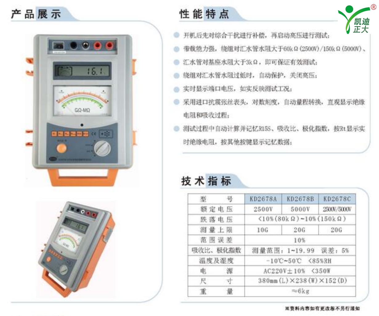 KD2678A水內(nèi)冷發(fā)電機(jī)絕緣測試儀專用于水內(nèi)冷發(fā)電機(jī)的測量試驗(yàn),同時(shí)也可用于試驗(yàn)室或現(xiàn)場做絕緣測試試驗(yàn),該儀器測量原理新穎,操作簡便,精度高,整機(jī)采用全集成電路,抗震能力強(qiáng),工作穩(wěn)定性好,輸出短路電流大,在現(xiàn)場環(huán)境下抗干擾能力強(qiáng)。執(zhí)行標(biāo)準(zhǔn):DL/T474.1-2006