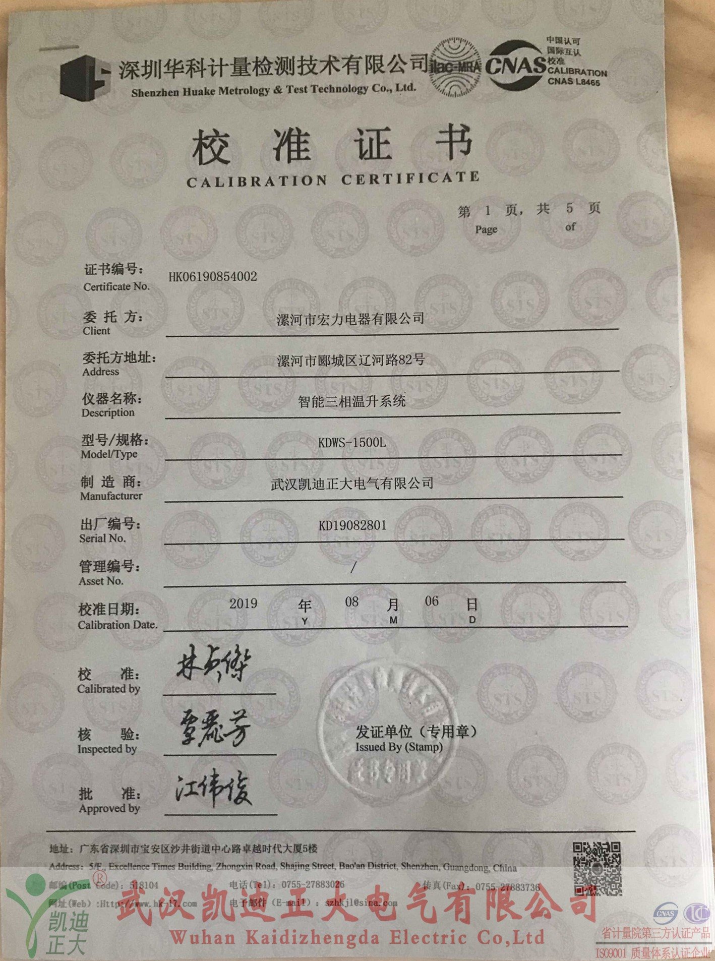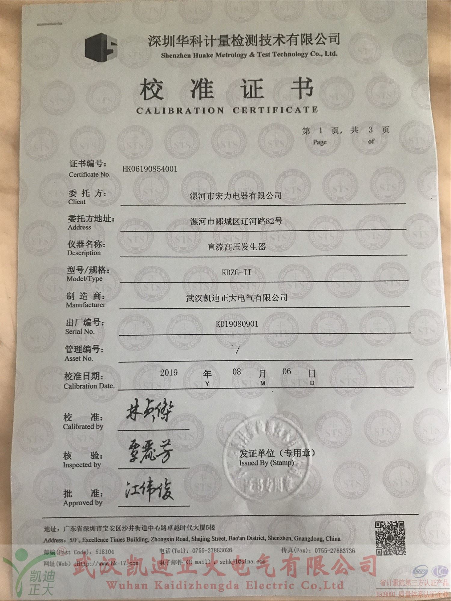 漯河宏力電器采購我司設備獲得深圳華科計量證書