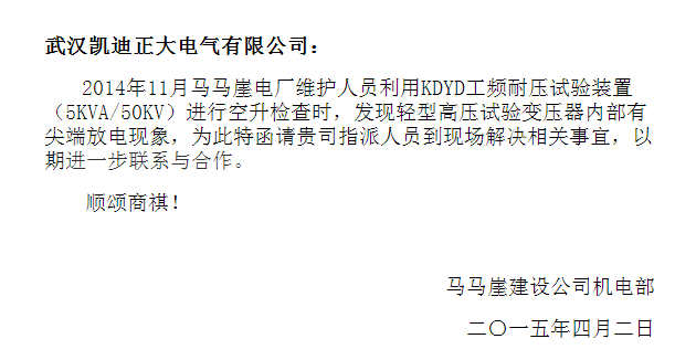 貴州黔源電力股份有限公司馬馬崖一級水電站項目建設以來,電氣設備運行前預試設備均使用武漢凱迪正大電氣有限公司提供。2015年4月2日,黔源電力馬馬崖水電站建設公司機電部致電我司,邀請我司技術前往指導KDYDJ工頻耐壓試驗裝置升壓試驗,此次采購的設備有KDYD工頻耐壓試驗操作箱、YDJ-5KVA50KV油浸式試驗變壓器。凱迪正大公司售后部人員隨時準備等待馬馬崖水電站的通知前往。