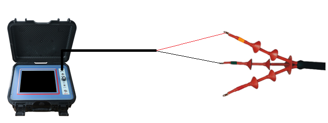 先將雙夾測(cè)試線接至(預(yù)定位儀后側(cè)板)采樣端口,再將測(cè)試線的紅夾子夾在電纜的一個(gè)好相,黑夾子夾在電纜的另一個(gè)好相。