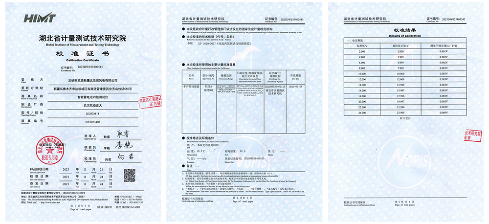 2023年11月24日三峽新能源新疆達坂城風電有限公司采購我司的KDZD818智能蓄電池內阻測試儀,順利通過湖北省計量測試技術研究院的校準。再次證明了我們的產品質量。這是喜訊進一步提升我們公司的品牌信譽,使更多的客戶和合作伙伴對我們公司產生信任和認可。