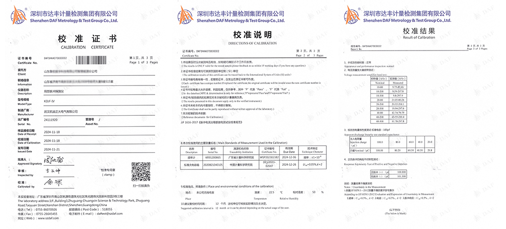 近日,山東某能源分公司采購凱迪正大電氣生產的KDJF-IV局部脈沖探測儀順利通過了深圳市達豐計量檢測集團有限公司的校準。