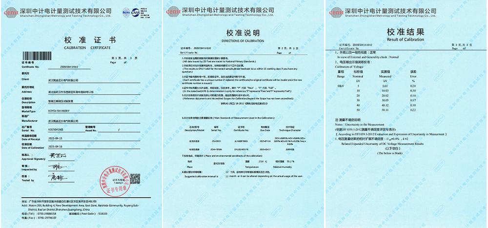 經過此次校準,KDYDJ-5kVA50kV智能工頻耐壓試驗裝置的可靠性得到了進一步驗證。其精確的電壓輸出、穩定的性能測試結果以及專業的校準服務,都彰顯了武漢凱迪正大電氣有限公司在電力測試設備領域的地位。
